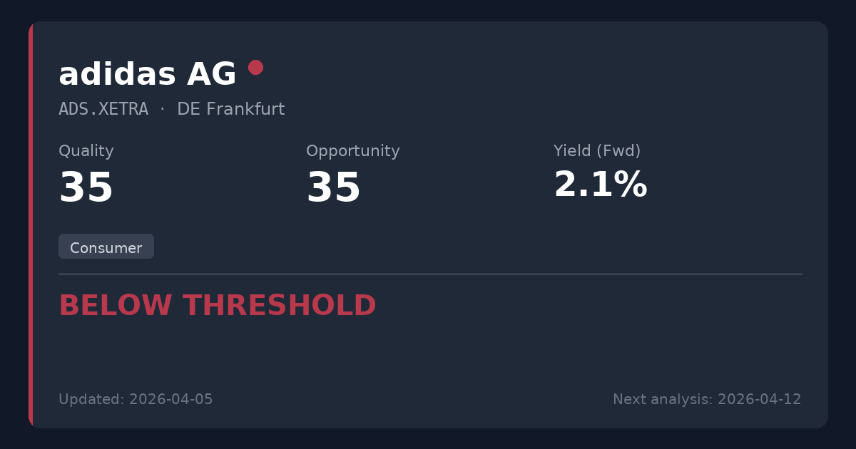 adidas AG is a global leader in the design and manufacturing of athletic footwear, apparel, and sporting goods. The consumer fashion and apparel sector is inherently cyclical and driven by discretionary spending and shifting consumer trends, making it generally unsuitable for conservative dividend strategies that require predictable, essential cash flows.