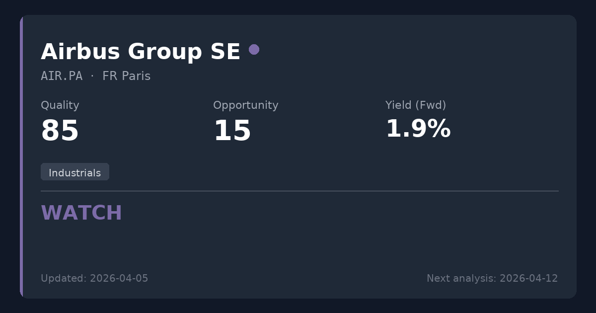 Airbus maintains a dominant position in the global commercial aviation duopoly, boasting a massive multi-year order backlog and an exceptionally strong balance sheet. While the underlying business quality is outstanding and recent major orders reinforce its moat, current valuation levels offer limited upside for income-focused investors. Existing shareholders should maintain positions given the robust fundamentals, but new investors may want to wait for a better entry point with a more attractive yield.