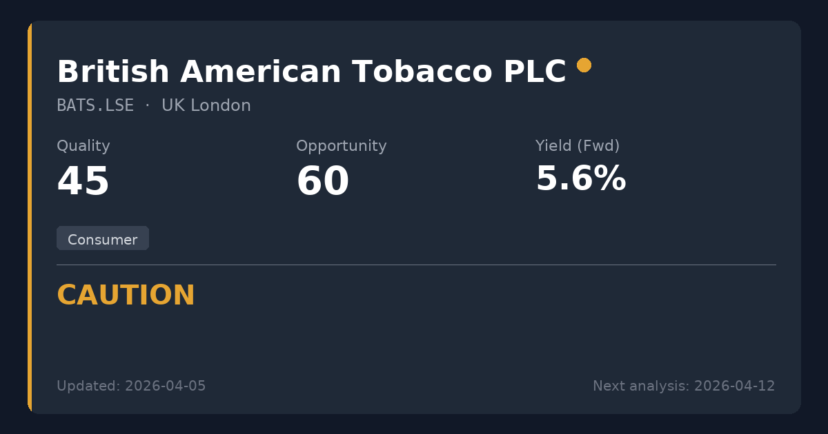 British American Tobacco is a massive global consumer goods company currently navigating a fundamental strategic transition away from traditional combustible products. While the 5.68% yield and P/E of 12.48 appear tempting, the structural decline of its core legacy business and strained cash flow dividend coverage make it an imperfect fit for conservative, perpetual dividend strategies. Not recommended for new positions, as the structural transition risks outweigh the attractive valuation.