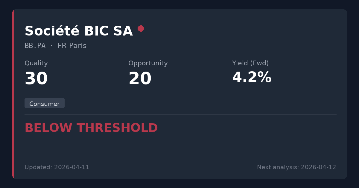 Société BIC is a global consumer goods manufacturer known for everyday items like pens, lighters, and shavers. Despite strong brand recognition and a solid balance sheet, chronic dividend cuts and structurally declining earnings make the company an unreliable income generator. Not recommended for new positions given the persistent fundamental challenges, contracting margins, and recent history of recurring dividend reductions, which firmly place it in the BELOW THRESHOLD quadrant.
