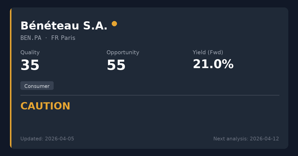Bénéteau is a leading global boat manufacturer navigating a severe cyclical downturn, though it maintains a fortress balance sheet with significant net cash. While the discounted valuation (P/B 0.80) and restructuring efforts present a tempting turnaround opportunity, the highly cyclical nature of the discretionary marine business and negative free cash flows make this unsuitable for conservative dividend strategies seeking stable income. Not recommended for new positions, as the structural strategy mismatch outweighs the value proposition.