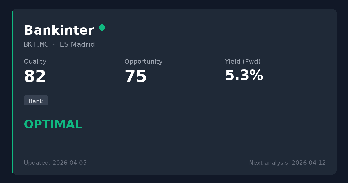 Bankinter is a leading Spanish commercial bank providing retail banking, wealth management, corporate banking, and insurance services across the Iberian peninsula. In the banking sector, metrics like high Debt/Equity ratios and negative Free Cash Flow are normal structural features (deposits are liabilities and growing loan books consume cash); investors should instead focus on Bankinter's exceptional ROE (17.7%) and well-managed payout ratio (51.8%), which indicate a highly efficient and well-capitalized institution.