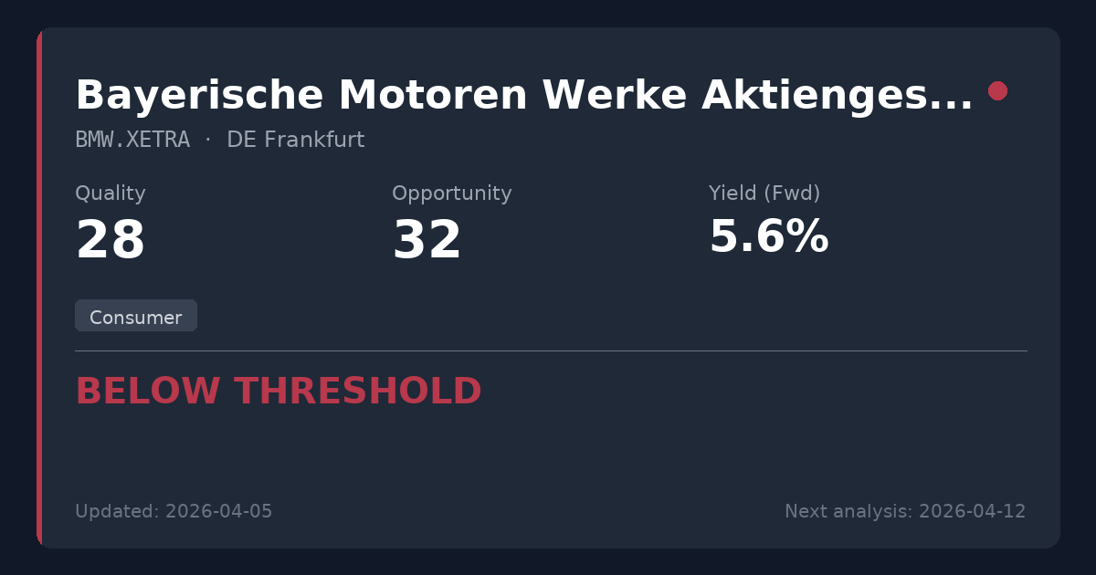BMW is a premium automaker navigating severe structural headwinds, including intense competition in China and a capital-intensive transition to electric vehicles. While the 6.67 P/E and 5.57% TTM yield might appear superficially cheap, negative free cash flow, high leverage, and an impending 33.6% dividend cut make this fundamentally misaligned with conservative income strategies. Not recommended for new positions given the significant operational risks and deteriorating dividend sustainability.