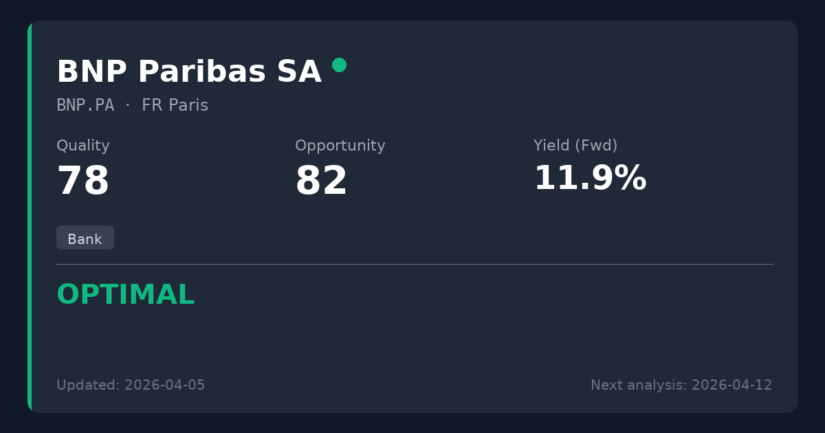 BNP Paribas is a systemically important global bank that provides essential retail, corporate, and institutional banking services across Europe and internationally. In the banking sector, standard debt metrics like Debt/EBITDA do not apply; high Debt/Equity ratios are structurally normal because customer deposits are recorded as liabilities, making the focus shift toward capital adequacy, net interest margins, and asset quality.