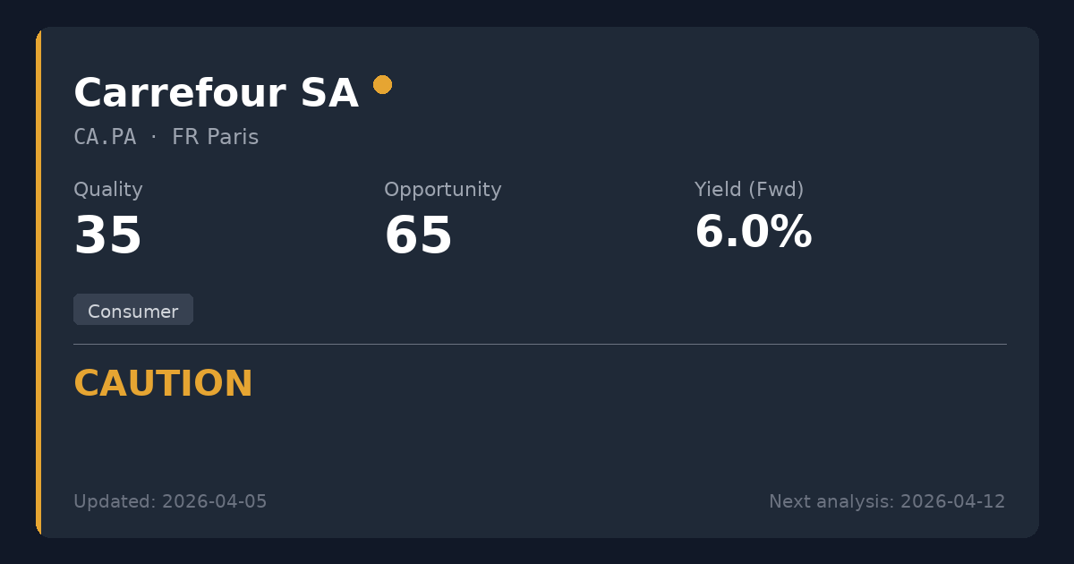 Carrefour is a major global grocery retailer, operating hypermarkets, supermarkets, and convenience stores across multiple continents. In the consumer staples sector, grocery operators benefit from highly defensive, recurring consumer demand but must navigate razor-thin margins, intense pricing competition, and significant capital expenditure requirements.