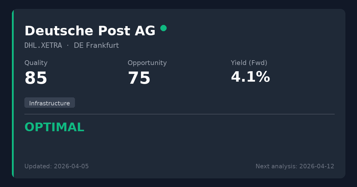Deutsche Post (DHL) operates a massive global logistics network and the primary postal service in Germany, generating revenue through parcel delivery, freight, and supply chain management. In the context of dividend investing, its infrastructure-like domestic postal monopoly and dominant position in the global logistics oligopoly provide the highly resilient, predictable cash flows essential for long-term dividend stability.