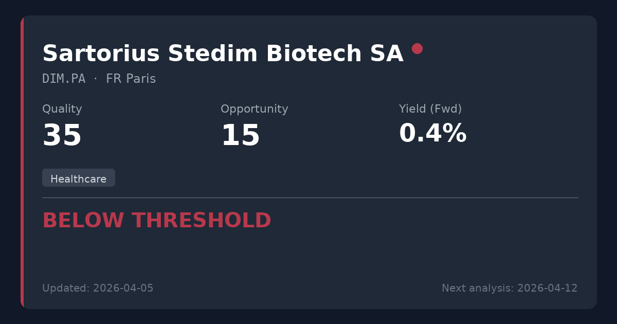 Sartorius Stedim Biotech is a high-quality global provider of biopharmaceutical equipment operating in an attractive oligopoly, though currently navigating a temporary post-pandemic sector destocking phase. While the core business model remains intact, the stock's profile fundamentally clashes with conservative dividend income investing. With a negligible 0.41% dividend yield and an extremely elevated trailing P/E of 61.95, this is not recommended for new positions, as better opportunities for sustainable income exist in more traditionally valued, high-yield essential services.