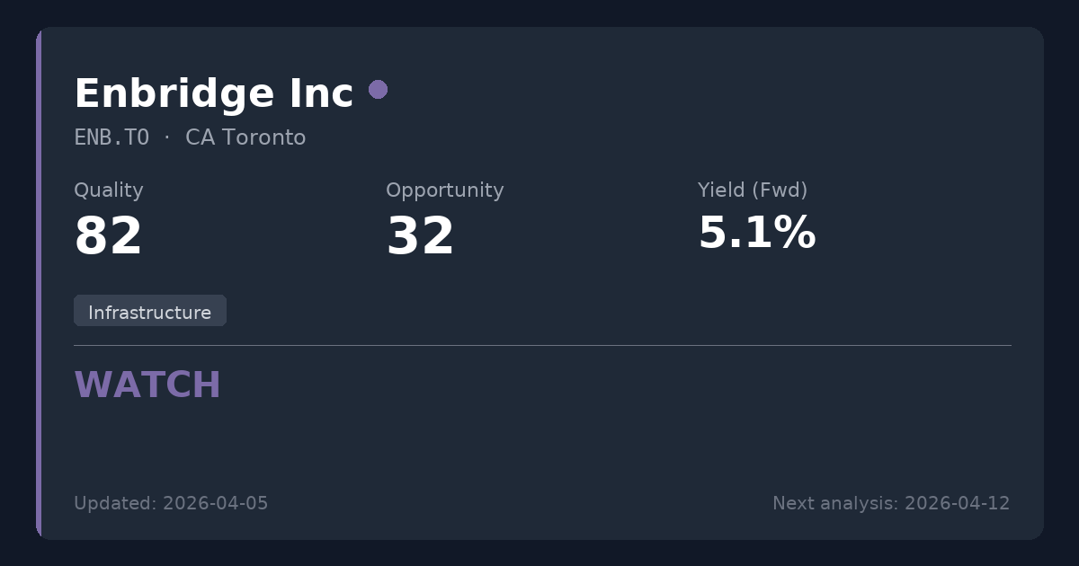 Enbridge is a premier North American energy infrastructure company operating a highly defensible network of pipelines and utility assets. While the company offers a highly reliable 5.06% TTM dividend yield backed by consistent operating cash flows and a strong 10-year growth history, the current valuation at a P/E of 22.00 offers limited upside multiple expansion. Existing shareholders should maintain positions to collect the reliable income, but new investors may want to monitor the stock for a better entry point closer to historical valuation norms.