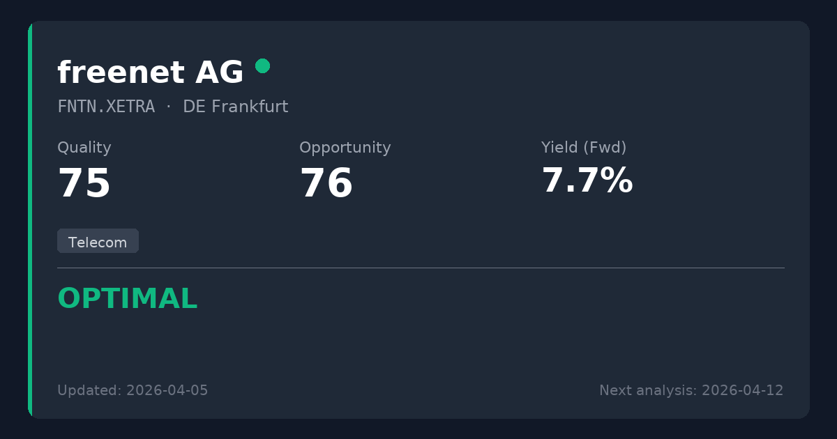freenet AG is Germany's largest network-independent telecommunications provider, offering mobile communications, internet, and digital lifestyle services. As an asset-light telecom provider, it operates in an essential services sector characterized by highly recurring, predictable cash flows, making it particularly suitable for dividend strategies as it avoids the heavy capital expenditure burdens of traditional network builders.