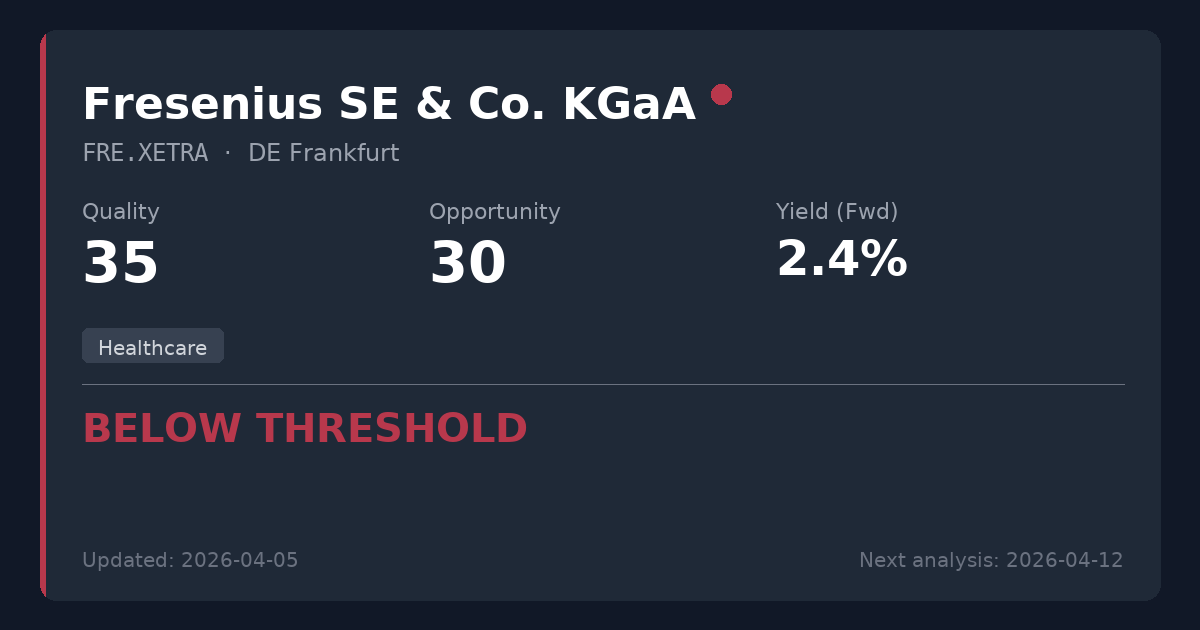 Fresenius is a major global healthcare group currently executing a comprehensive corporate restructuring through its 'FutureFresenius' initiative. While underlying hospital operations remain robust and recent headline losses are tied to temporary structural shifts, the stock falls into the BELOW THRESHOLD quadrant due to its sub-3% yield and history of unreliable payouts. Not recommended for new positions, as conservative dividend investors can find better opportunities in more stable businesses with proven, growing dividends.