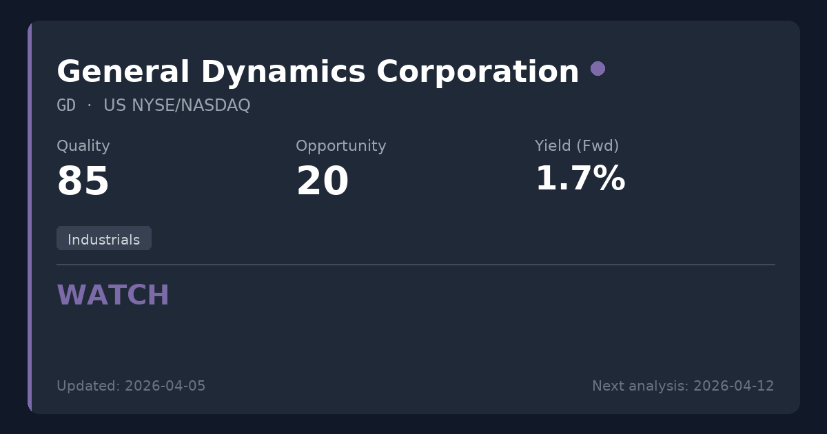 General Dynamics is a global aerospace and defense company primarily involved in manufacturing nuclear submarines, combat vehicles, weapons systems, and business jets. In the context of dividend investing, major defense contractors operate as highly entrenched oligopolies with immense competitive moats, supported by long-term, highly predictable government contracts that provide recession-resistant cash flows.