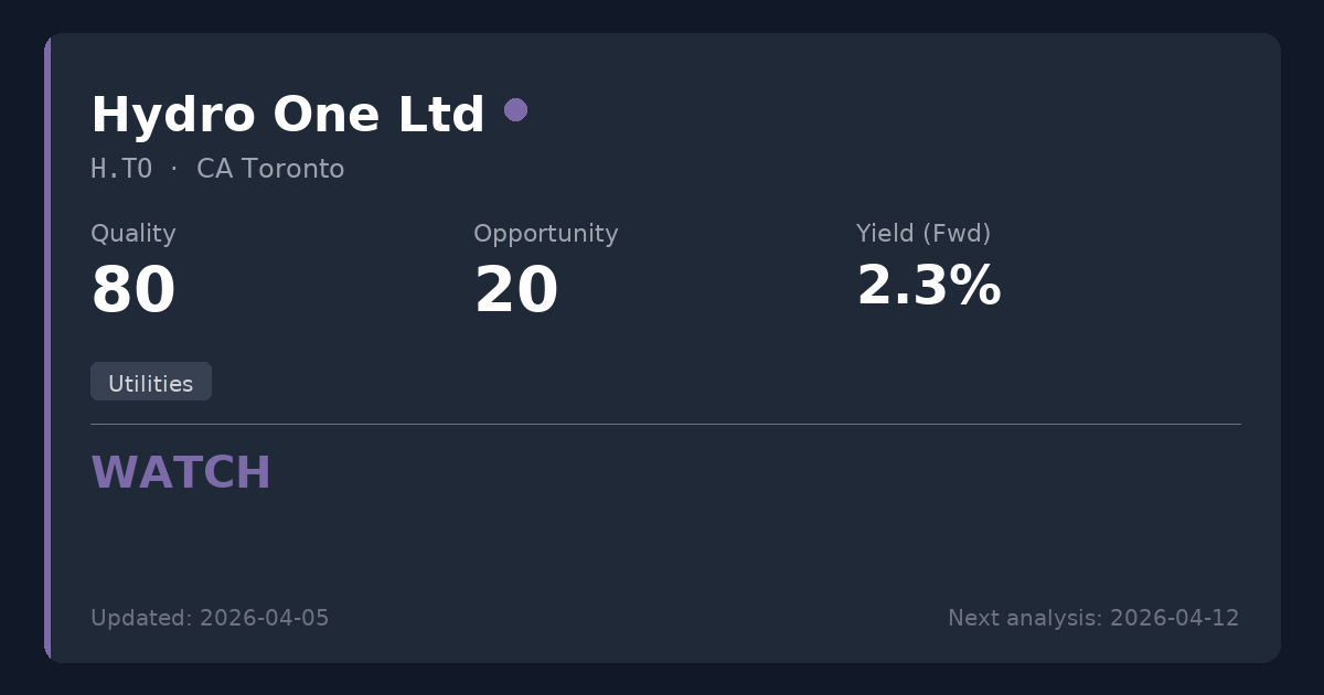 Hydro One is a premier Canadian utility operating as a regulated natural monopoly over Ontario's electricity network, providing exceptional long-term stability and earnings visibility. While the underlying business quality is outstanding and recent management transitions appear orderly, the current premium valuation (P/E 26) and low yield (2.27%) offer limited upside. Existing shareholders should maintain positions given the immense moat, but new investors may want to wait for a meaningful pullback closer to historic utility multiples before initiating positions.