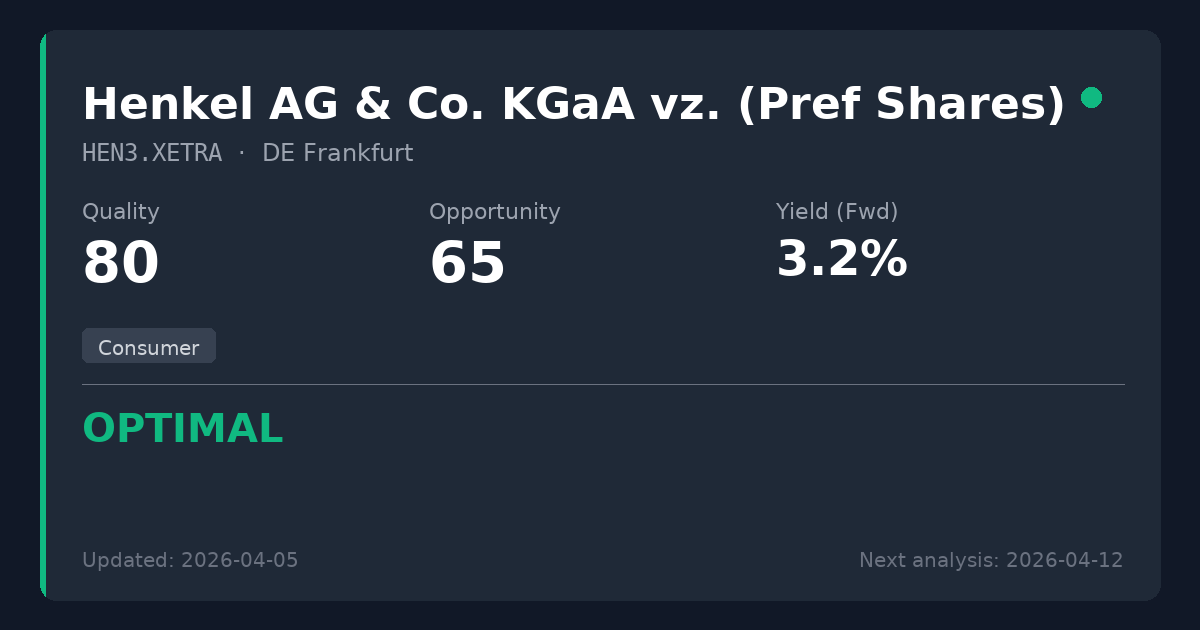 Henkel is a high-quality global consumer and industrial leader boasting a fortress balance sheet and exceptional free cash flow generation. Trading at €64.78, the stock sits below our fair value estimate of €73-83 (blended P/E and dividend-based valuation), offering approximately 12-28% upside potential. Worth considering for new positions at current levels, as the very secure 3.1% yield provides reliable income while investors wait for temporary integration headwinds and input cost pressures to subside.