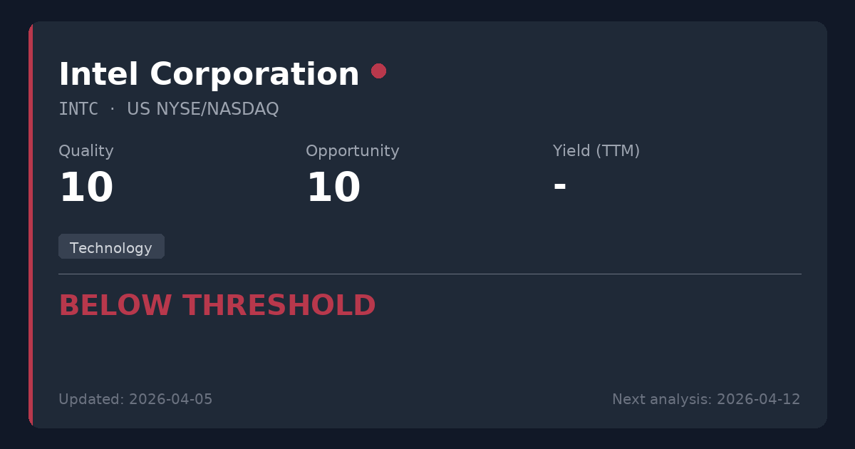 Intel is a legacy semiconductor manufacturer undergoing a massive, capital-intensive transformation to build out its foundry business amid severe competitive pressures. The structural shift requires significant capital allocation, leading to extensive operating losses and multiple severe dividend cuts, fundamentally misaligning with a strategy focused on predictable cash flows. Not recommended for new positions, as the structural execution risks severely outweigh any potential long-term benefits for income investors.