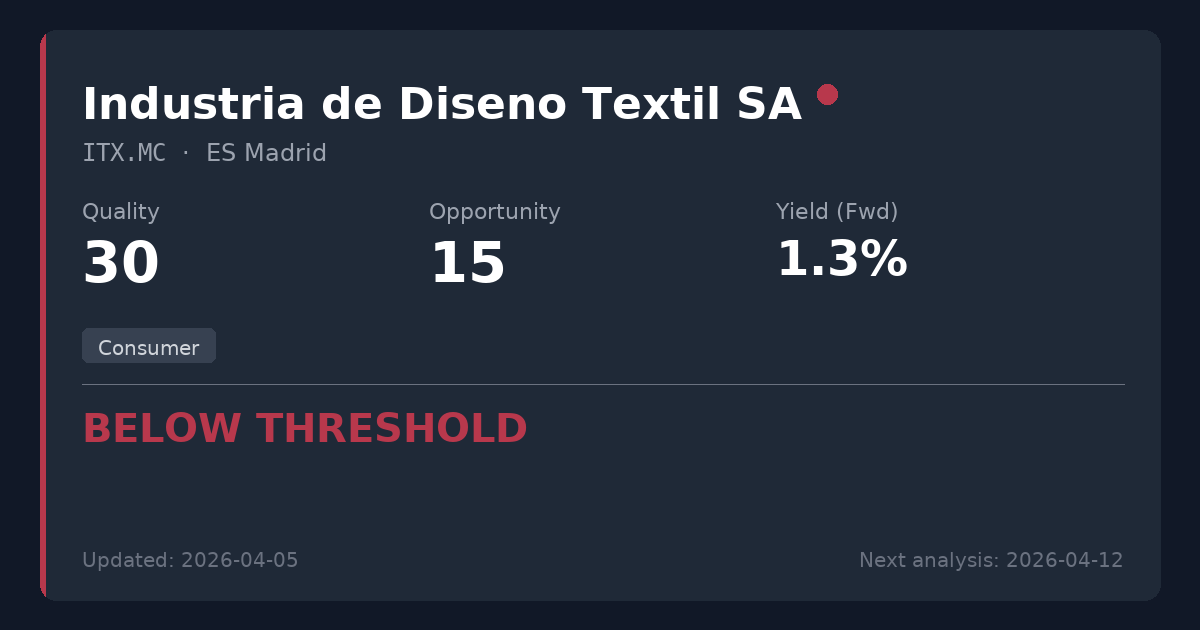 Inditex is a global fashion retailer that designs, manufactures, and sells apparel under well-known brands such as Zara. For conservative dividend investing, the fashion sector is generally avoided due to its reliance on discretionary consumer spending and constantly shifting trends, lacking the predictable and essential cash flows found in utilities or infrastructure.