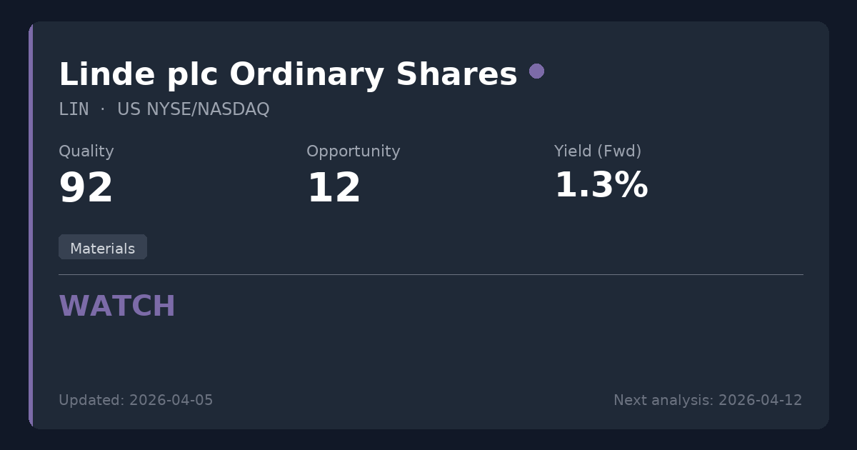 Linde operates as a dominant player in the global industrial gas oligopoly, providing essential gases like oxygen, nitrogen, and hydrogen to diverse industries under long-term contracts. This business model generates highly predictable, utility-like cash flows with significant pricing power and exceptionally high barriers to entry, making it an incredibly resilient asset for long-term compounders.