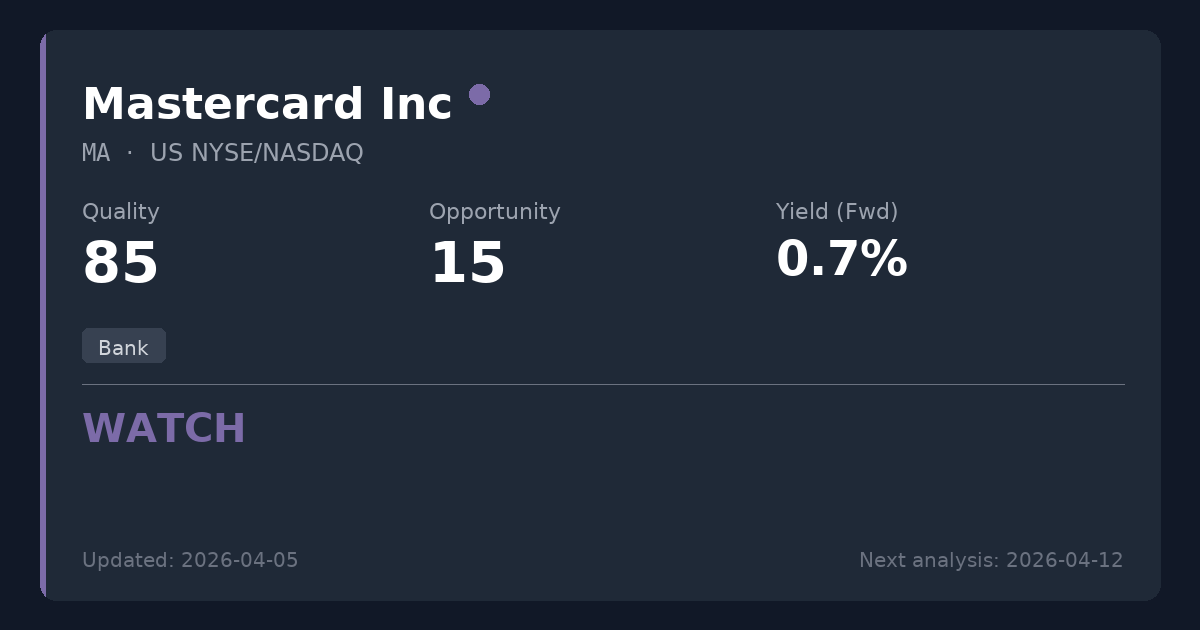 Mastercard operates a formidable global duopoly in essential payment infrastructure, generating exceptional profitability and reliable cash flows. While the company offers flawless dividend growth and a pristine balance sheet, current valuation at nearly 30x earnings and a 0.64% yield offers limited upside for pure income investors. Existing shareholders should maintain positions given the immense economic moat, but new investors seeking immediate yield may want to monitor for a better entry point.