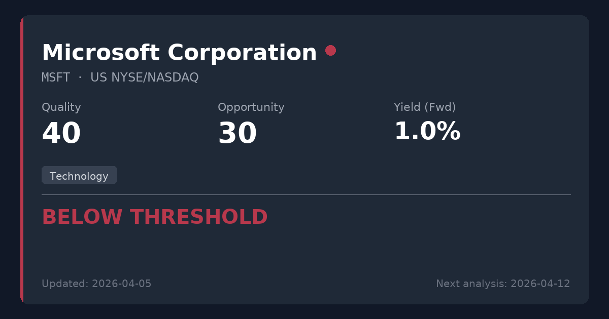 Microsoft is a dominant global technology leader with an exceptional balance sheet and highly profitable business model. However, its 0.94% dividend yield, elevated 23.37 P/E ratio, and classification in the fast-changing technology sector place it in the BELOW THRESHOLD quadrant. Not recommended for new positions given the fundamental mismatch with our conservative dividend value strategy.