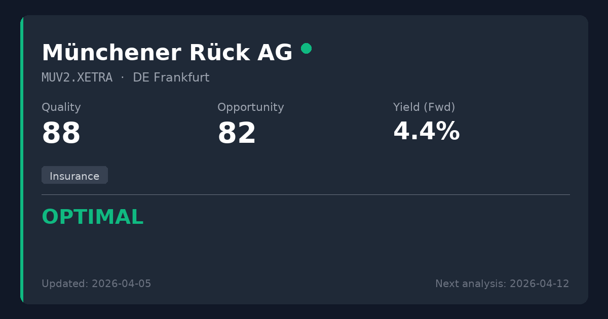 Munich Re is a globally dominant reinsurance provider offering essential financial stability with exceptionally reliable capital management. The stock's recent pullback—driven by minor analyst concerns over AI-related risks and broader macroeconomic hesitation—creates an attractive opportunity for a company that just posted record profits and a massive dividend hike. Trading at a P/E of 11.6 with a 4.4% yield, it is worth considering for new positions as it sits securely within our optimal valuation range.