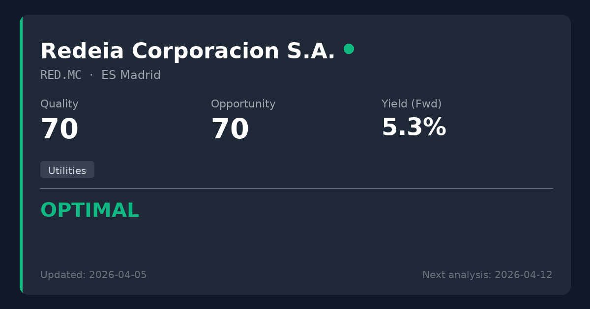 Redeia is the natural monopoly operator of Spain's electricity transmission grid, offering highly resilient cash flows and a critical role in the ongoing energy transition. The recent earnings dip and subsequent modest dividend adjustments are prudent strategic resets to fund record network investments and account for a one-time divestment loss, rather than signs of fundamental distress. Worth considering for new positions at current levels around €15, providing an attractive 5.3% yield backed by an unassailable competitive moat.