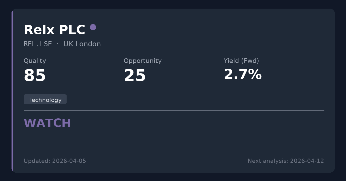 Relx PLC is a global provider of information-based analytics and decision tools for professional and business customers, operating heavily in scientific, technical, medical, and legal sectors. While classified as Technology—a sector generally avoided in this strategy due to rapid obsolescence—Relx functions more like a defensive data monopoly with highly predictable, subscription-based recurring revenue.