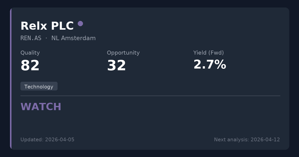 RELX is a global leader in information-based analytics with world-class competitive moats in essential B2B data across its scientific, legal, and risk divisions. While the company offers exceptional long-term fundamentals and a highly secure dividend backed by strong free cash flow, the current valuation at a P/E near 26 offers limited upside. Existing holders should maintain positions given the high business quality and consistent dividend growth, but new investors may want to wait for a more attractive entry point.