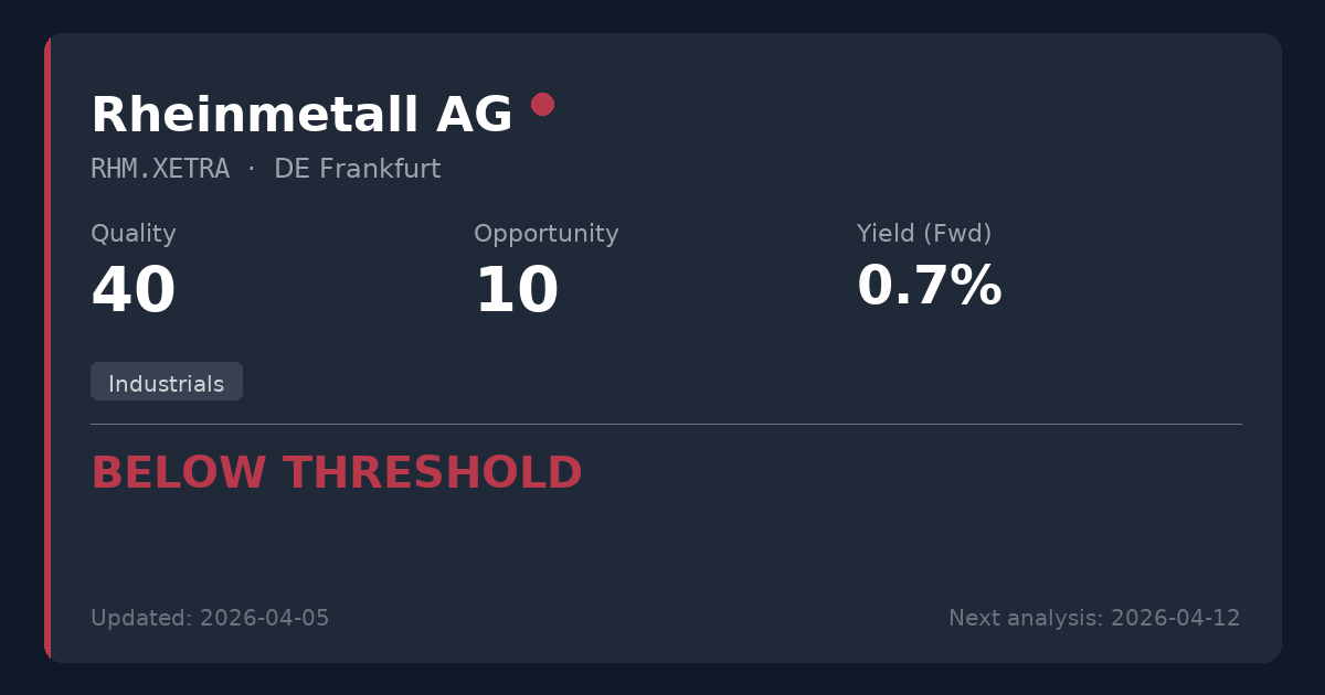 Rheinmetall is a financially strong defense contractor experiencing a massive growth cycle, but its profile completely misaligns with our conservative dividend value strategy. With an extreme valuation profile and a negligible 0.73% dividend yield, the stock offers no margin of safety or meaningful income for dividend investors. Not recommended for new positions, as better income opportunities exist in stable, reasonably valued essential service sectors.