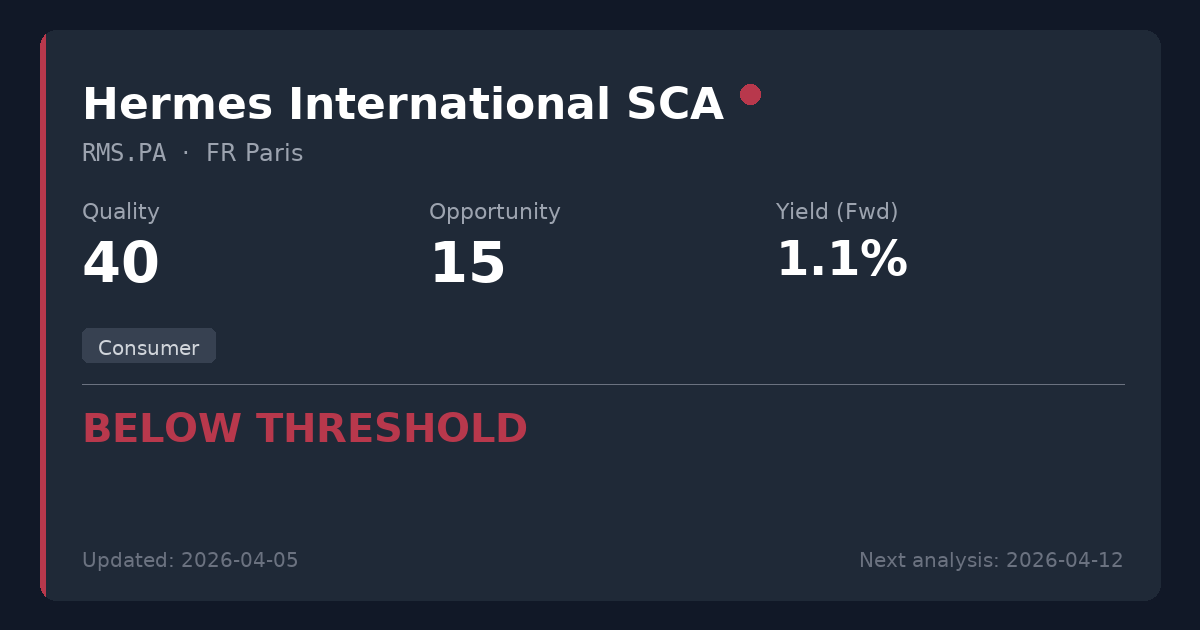 Hermès is an exceptionally well-run luxury brand with a pristine balance sheet and stellar margins, but it fundamentally conflicts with our essential services dividend strategy. The combination of a 1.08% yield, a P/E near 39x, and a confirmed 32.4% upcoming dividend cut makes this stock unsuitable for income-focused investors. Not recommended for new positions given the extreme strategy mismatch and lack of margin of safety.