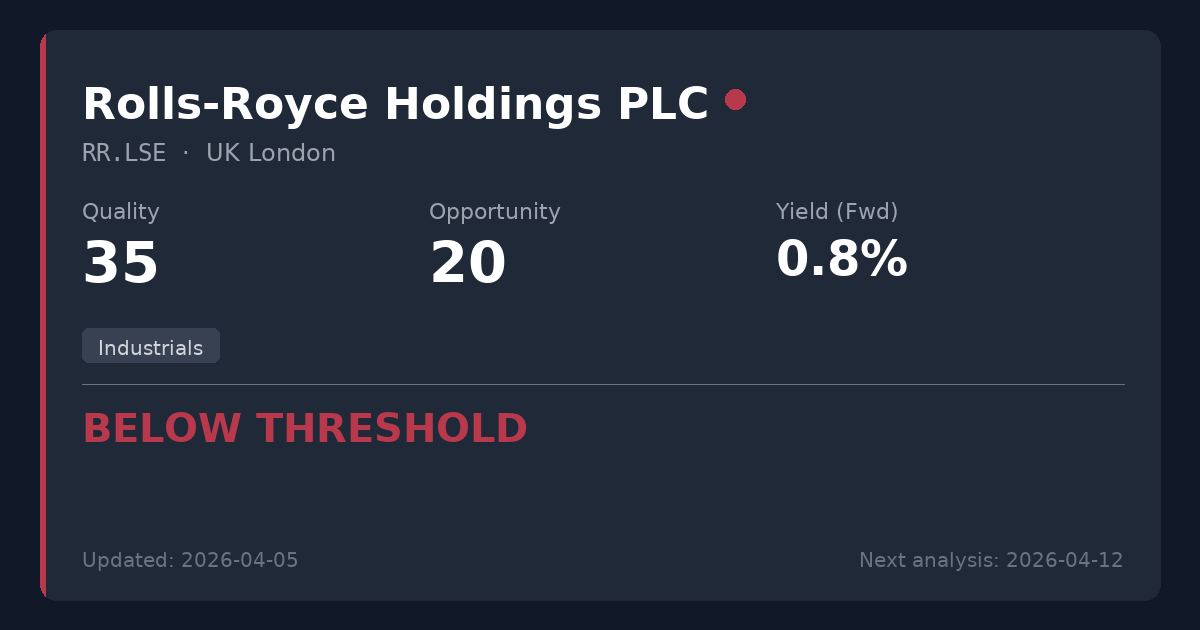 Rolls-Royce designs, manufactures, and services mission-critical power systems for the civil aerospace, defense, and power systems markets. While the company enjoys strong barriers to entry and long-term service contracts, the aerospace industry is highly cyclical and vulnerable to geopolitical shocks, making it inherently challenging for generating the stable, uninterrupted dividends favored by conservative income strategies.