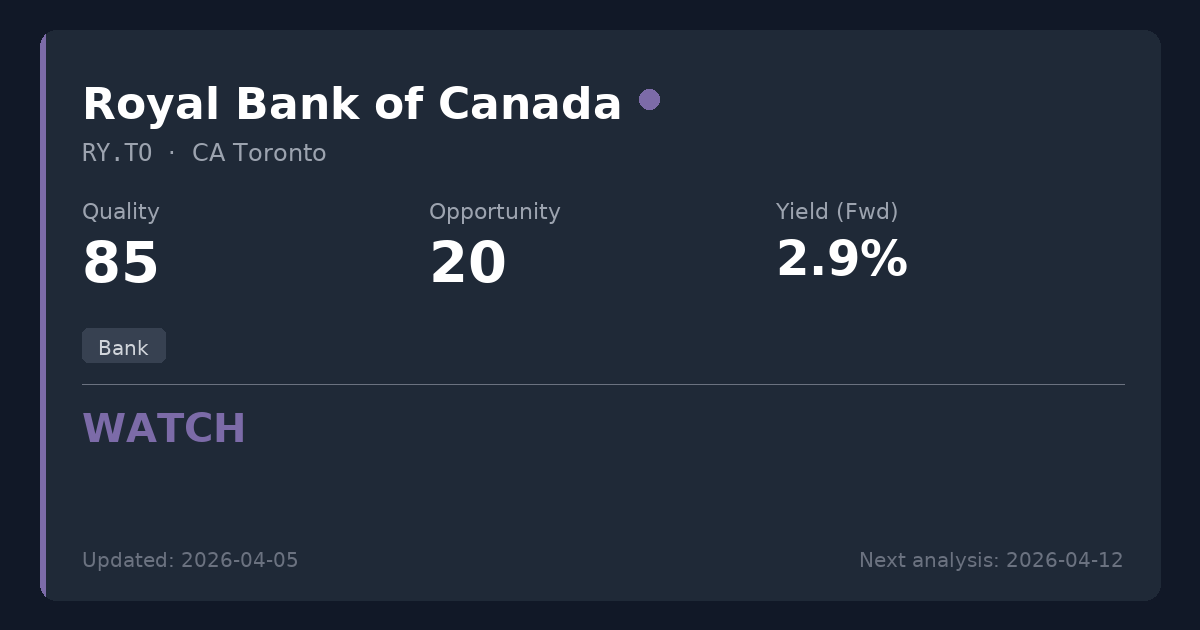 Royal Bank of Canada is a premier financial institution operating within the highly protected Canadian banking oligopoly, delivering exceptional ROE and reliable long-term growth. While the bank's operational quality is outstanding and its dividend is deeply secure, the current 15.8x P/E valuation and 2.73% yield offer limited upside for new capital. Existing shareholders should maintain positions given the pristine fundamentals, but new investors may want to wait for a broader market pullback to provide a more attractive entry point.