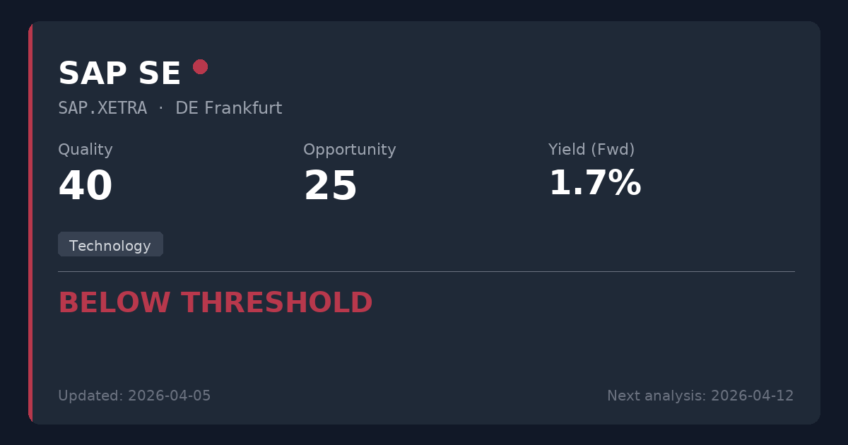 SAP is a dominant global leader in enterprise software with a pristine balance sheet and exceptionally high customer switching costs. While the recent quarterly loss was merely a temporary restructuring charge masking strong underlying cloud growth, the combination of a low 1.68% yield, elevated valuation (P/E ~24x), and technology sector classification makes it a structural mismatch for conservative, income-focused portfolios. Not recommended for new positions, as better opportunities exist in more traditional essential service sectors with higher yields.