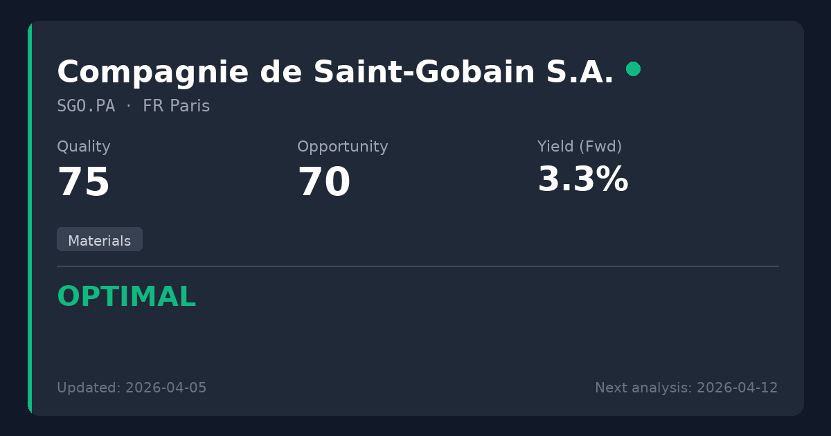 Compagnie de Saint-Gobain designs, manufactures, and distributes high-performance materials and solutions for the construction, mobility, and industrial markets worldwide. While the building materials sector is inherently cyclical and highly sensitive to interest rates and energy input costs, Saint-Gobain's massive global scale and focus on sustainable, energy-efficient building solutions provide a durable competitive moat. For dividend investors, the company's robust free cash flow generation enables it to maintain and grow distributions even during economic downcycles.
