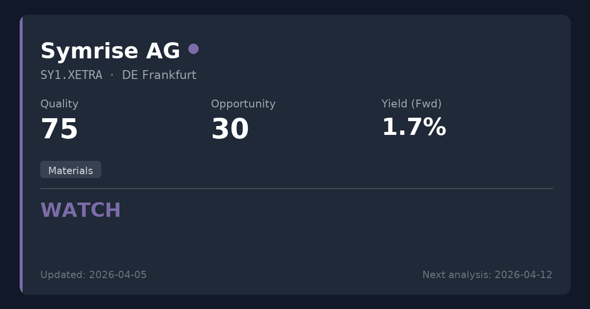 Symrise AG operates as a high-quality global leader in the consolidated flavors and fragrances oligopoly, benefiting from highly defensive and recurring revenue streams. While recent one-time non-cash impairment charges temporarily distorted trailing earnings metrics, the underlying operational cash flows remain exceptionally strong and securely cover the dividend. Existing shareholders should maintain positions given the company's resilient fundamentals, but new investors may want to wait for an entry point that provides a higher yield and more attractive valuation.