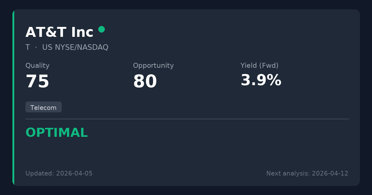 AT&T is a dominant US telecommunications provider, offering essential wireless, broadband, and fiber network services to millions of consumers and businesses. In the telecom sector, significant capital expenditure is required to maintain and upgrade network infrastructure, which typically results in higher but manageable debt levels backed by highly predictable, recurring subscription revenues.