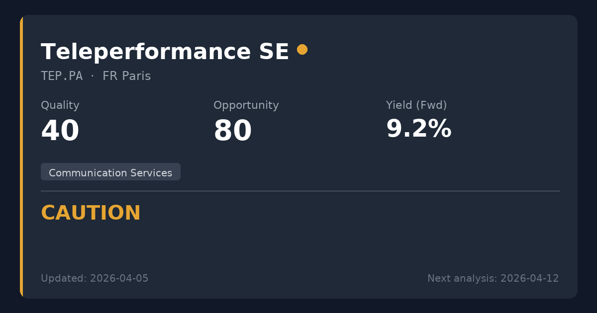 Teleperformance is a global leader in outsourced customer experience management and communication services. While the exceptionally low P/E of 5.85 and well-covered 9.09% yield appear mathematically compelling, the core labor-intensive business model faces severe structural disruption risks from Generative AI. Not recommended for new positions, as the technological obsolescence risk makes this a potential value trap rather than a temporary buying opportunity for conservative dividend investors.