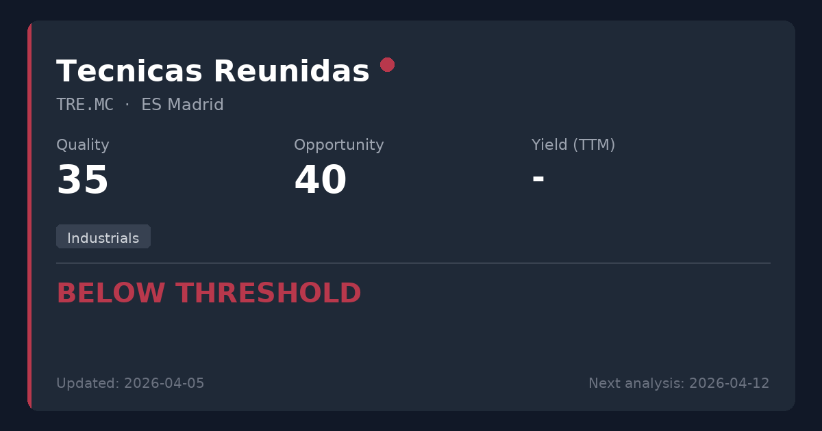 Técnicas Reunidas is a global engineering and construction firm focused primarily on large energy and industrial projects. Despite a strong net cash position and recent high-profile contract wins, its highly cyclical business model, thin margins, and history of severe dividend suspensions make it unsuitable for a conservative dividend income strategy. Not recommended for new positions, as better opportunities exist in stable essential services with predictable recurring revenues.