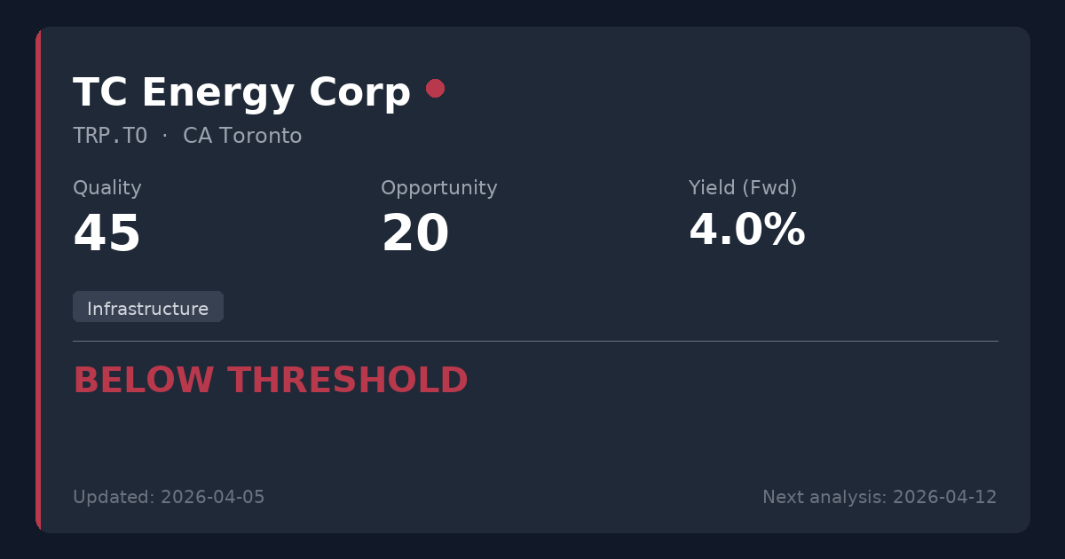 TC Energy operates an extensive network of natural gas pipelines, liquids pipelines, and power generation facilities across North America. In the infrastructure sector, while stable regulated or contracted cash flows allow for higher leverage than typical industrials, a Net Debt/EBITDA above 5x still warrants caution, particularly when heavy capital expenditures consume most operating cash flow.
