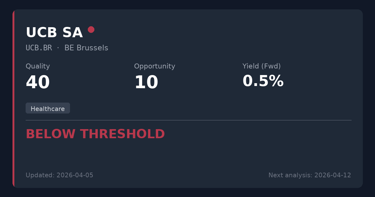 UCB SA is a high-performing biopharmaceutical company with excellent operational momentum and a pristine balance sheet. However, with an elevated P/E ratio exceeding 32x and a negligible dividend yield of 0.54%, it functions strictly as a growth stock rather than a dividend value play. Not recommended for new positions, as the structural characteristics and valuation are a complete mismatch for conservative income strategies.