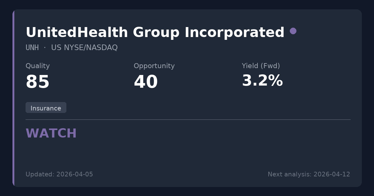 UnitedHealth Group is a dominant health insurance provider with an exceptional dividend growth history and highly defensive, essential service characteristics. While recent earnings were temporarily depressed by one-time divestiture charges and a cyberattack, the current valuation offers limited upside for new capital. Existing shareholders should maintain positions given the exceptionally secure 3.19% yield and strong free cash flow coverage, but new investors may want to wait for a more attractive entry point.