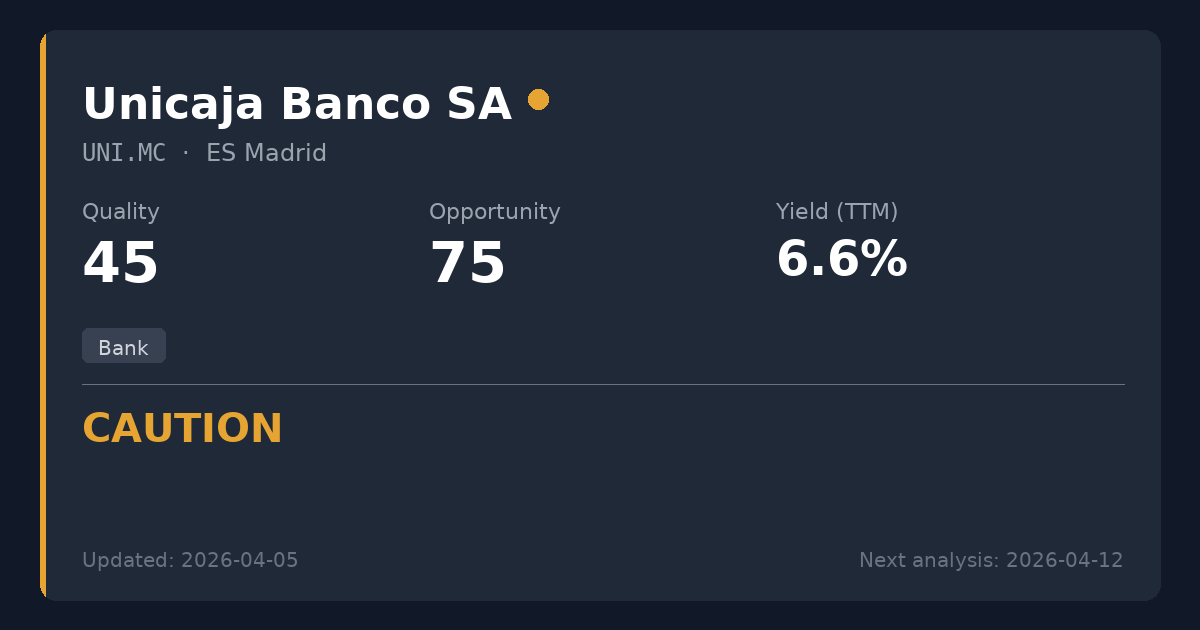Unicaja Banco is a prominent Spanish regional commercial bank offering an attractive 6.62% dividend yield. While the extremely low forward valuation (P/E of 5.8) presents a tempting entry point, structural concerns regarding the 5-year earnings decline and high payout ratio place this in the CAUTION quadrant. Not recommended for new positions given the current fundamental trajectory, though existing shareholders should maintain positions to collect the yield while monitoring for earnings stabilization.