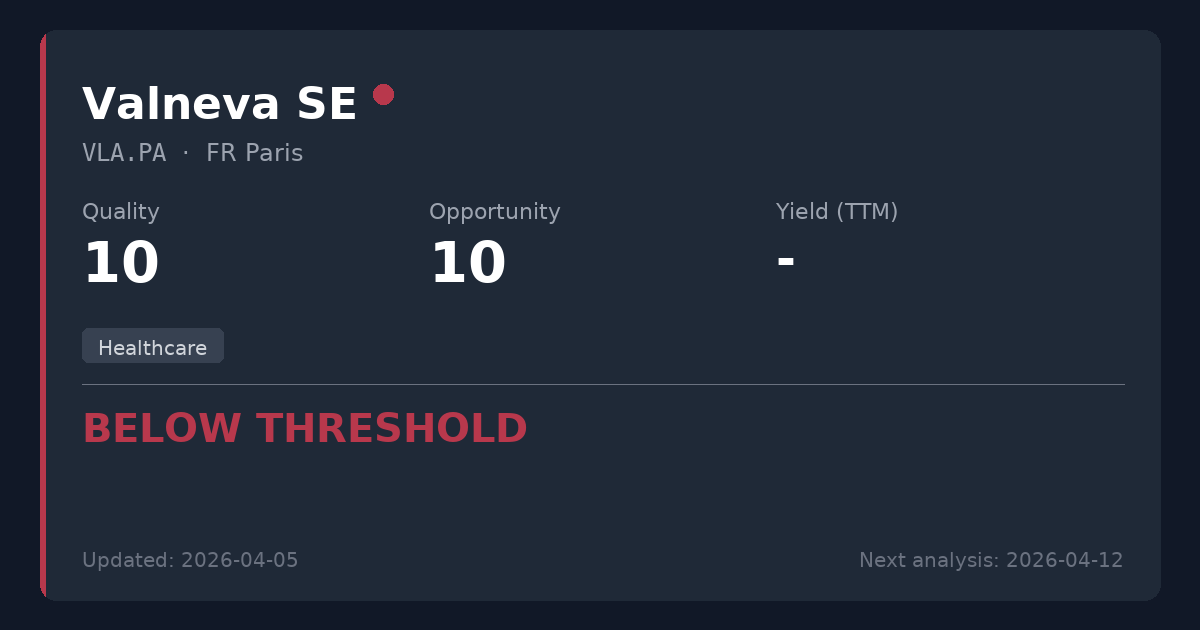 Valneva SE is a specialized vaccine developer operating a cash-burning biotech model that fundamentally contradicts conservative dividend investing principles. With persistent negative free cash flow (-€42.3M) and structural unprofitability over the past decade, the stock offers no income or stability. Not recommended for new positions, as the extreme valuation multiples and lack of dividends make it entirely unsuitable for an income-focused portfolio.