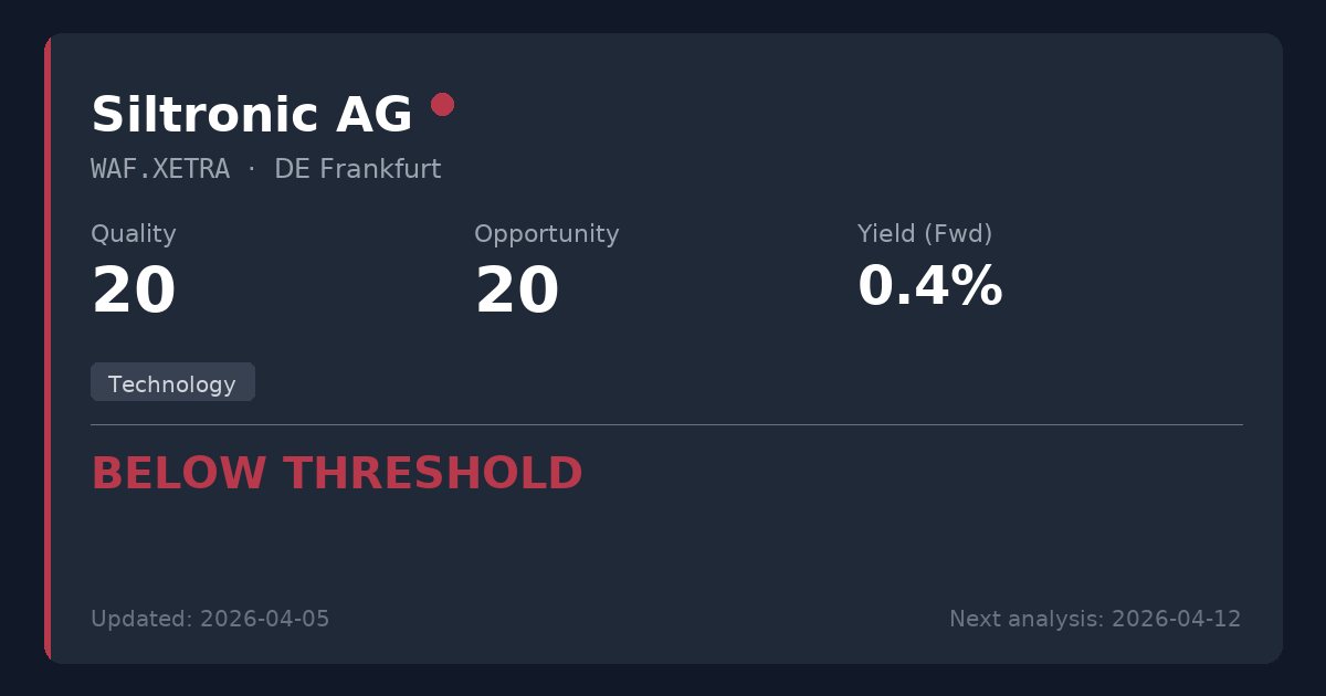 Siltronic AG is a major global manufacturer of hyperpure silicon wafers, supplying the foundational materials used by the semiconductor industry to create microchips. This places the company in the Technology sector, which is heavily cyclical, highly capital-intensive, and subject to rapid inventory corrections, making it fundamentally incompatible with strategies seeking stable, predictable cash flows for reliable dividend income.