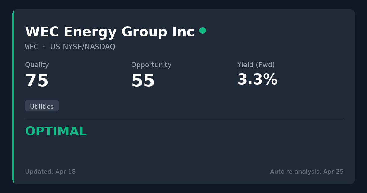 Moved from WATCH to OPTIMAL: Reassessed valuation utilizing P/FFO (10.9x) rather than GAAP P/E (24.4x), as P/FFO more accurately captures the robust cash generation beneath WEC's heavy capital investment program. On an FFO basis, shares are fundamentally undervalued.