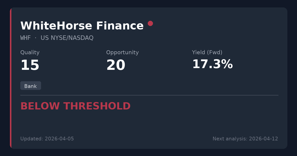 WhiteHorse Finance operates in the banking sector, specifically functioning as a business development company that provides debt financing to mid-market enterprises. While the traditional banking sector can offer stable dividends, companies focused on higher-risk middle-market lending face significant cyclical credit exposure and NAV volatility, making them highly vulnerable during times of spread compression and economic uncertainty.