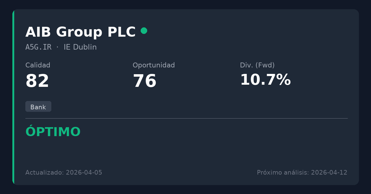 AIB Group es una institución financiera altamente rentable que opera dentro del duopolio bancario irlandés fuertemente consolidado, ofreciendo una excelente ventaja competitiva por servicio esencial. La compañía sigue ofreciendo rentabilidades excepcionales a los accionistas, habiendo elevado recientemente sus previsiones y anunciado una recompra de acciones de 1.000 millones de euros junto con su dividendo sostenible. Cotizando a un atractivo PER forward de 10,04 con una rentabilidad por dividendo del 6,5% bien cubierta, representa un punto de entrada convincente para inversores de dividendo que buscan exposición financiera de calidad. Merece la pena considerar para nuevas posiciones a los niveles actuales.