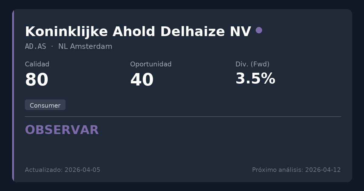 Koninklijke Ahold Delhaize es un minorista de alimentación líder a nivel mundial que opera supermercados, tiendas de conveniencia y servicios de entrega online en Europa y Estados Unidos. En el contexto de la inversión en dividendos, el sector de la alimentación proporciona flujos de caja muy defensivos y resistentes a la recesión, debido a la naturaleza esencial del consumo de alimentos, lo que permite una retribución de capital fiable a pesar de sus márgenes de beneficio típicamente ajustados.