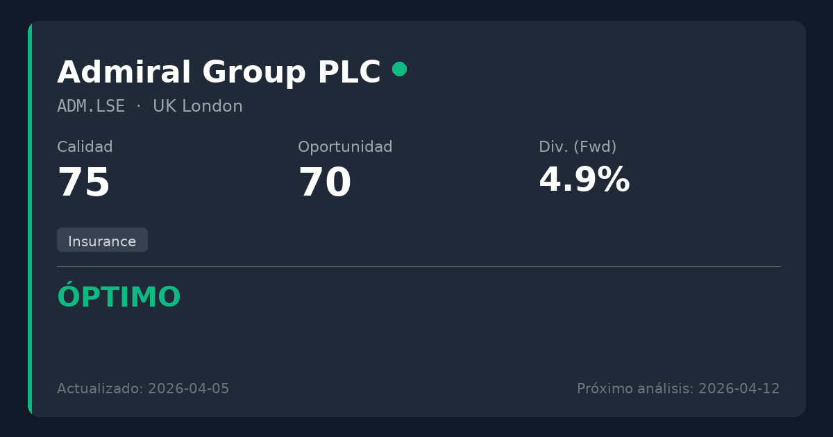 Admiral Group es un proveedor de seguros británico altamente rentable y con eficiencia de capital que ha sorteado con éxito la reciente inflación cíclica de siniestros para registrar beneficios récord. Cotizando a 3214 GBX, la acción se sitúa por debajo de nuestra estimación de valor razonable de entre 3450 y 3700 GBX (lo que representa un potencial de revalorización del 7-15%), convirtiéndola en una opción a considerar para nuevas posiciones. Su atractivo PER de 13,3x y una rentabilidad por dividendo del 5,0% ofrecen un punto de entrada atractivo para inversores en dividendos que buscan exposición financiera de calidad.