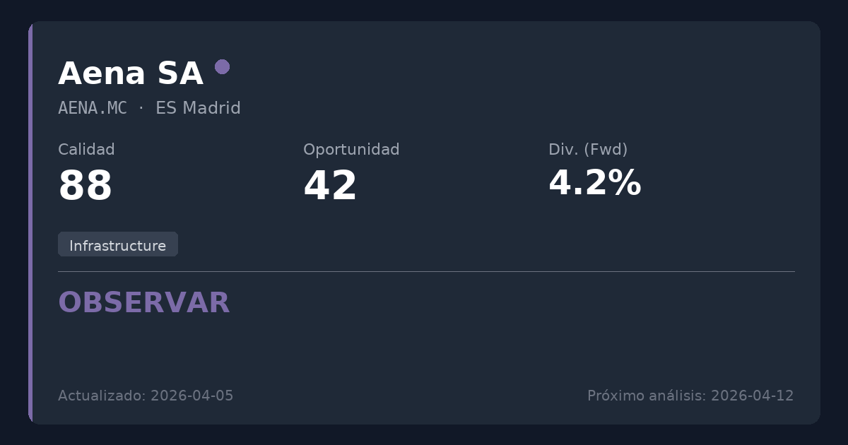 Aena es un operador de infraestructuras de clase mundial que posee un monopolio natural sobre la red aeroportuaria de España, complementado con activos internacionales en crecimiento, como la reciente concesión de Galeão en Brasil. Si bien la calidad del negocio subyacente es sobresaliente, con márgenes sólidos y una rentabilidad por dividendo segura del 4,19%, la valoración actual ofrece un potencial alcista limitado. Los accionistas actuales deberían mantener sus posiciones, pero los nuevos inversores podrían querer esperar un punto de entrada más atractivo.
