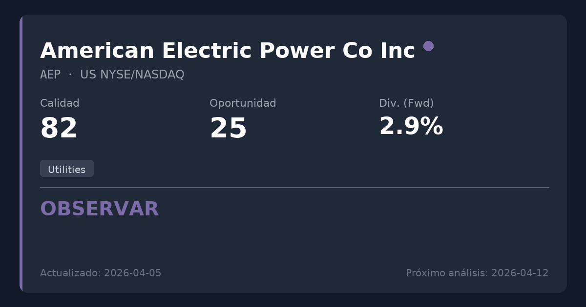 American Electric Power es una importante sociedad holding de servicios públicos (utilities) regulados que genera, transmite y distribuye electricidad a millones de clientes. En el contexto de la inversión en dividendos, los servicios públicos (utilities) regulados son muy valorados por sus monopolios naturales, demanda inelástica y flujos de caja predecibles basados en tarifas, lo que justifica, por lo general, mantener mayores niveles de deuda y múltiplos de valoración ligeramente superiores en comparación con las corporaciones estándar.
