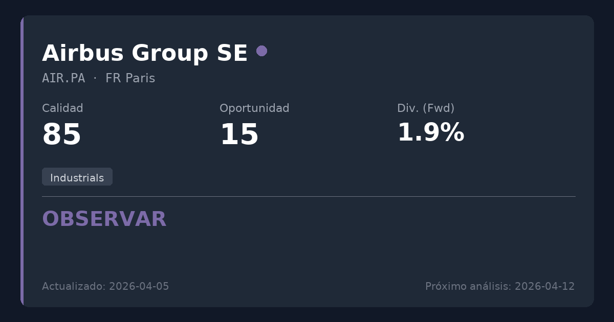 Airbus mantiene una posición dominante en el duopolio global de la aviación comercial, con una cartera de pedidos masiva para varios años y un balance excepcionalmente sólido. Aunque la calidad subyacente del negocio es excelente y los recientes pedidos importantes refuerzan su foso económico, los niveles de valoración actuales ofrecen un potencial alcista limitado para inversores centrados en ingresos. Los accionistas actuales deberían mantener sus posiciones dados los sólidos fundamentales, pero los nuevos inversores quizás deseen esperar un mejor punto de entrada con una rentabilidad más atractiva.